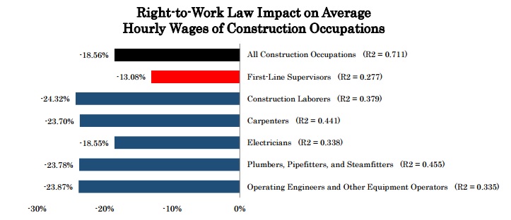 The results are consistent with previous research. Right-to-work laws reduce worker wages while simultaneously increasing income inequality in construction.