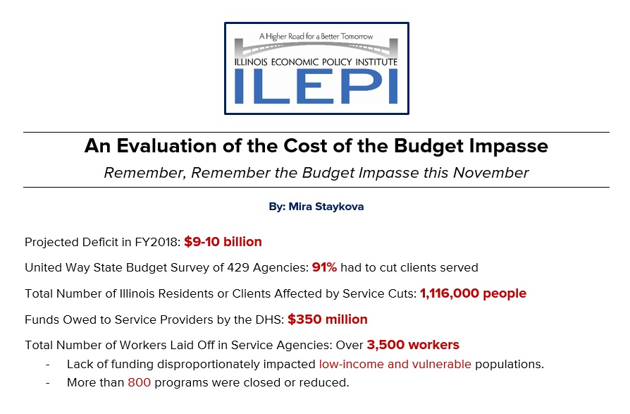 Illinois lawmakers finally negotiated a stopgap deal to fund the state over the next six months. While this was a great first step, the Illinois public should not soon forget the costs of the budget impasse. Here is a super-quick rundown of the costs that the Illinois Economic Policy Institute compiled over the weekend.