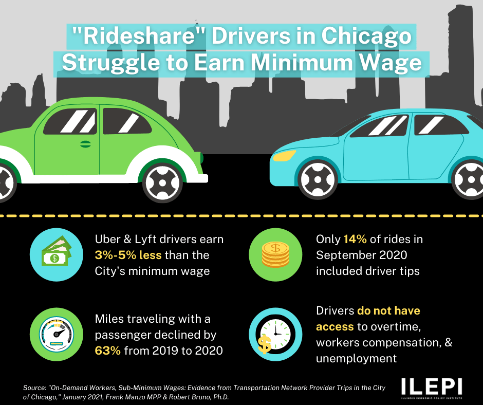 “The status quo for ‘gig’ workers only embeds a new low-wage contingent labor force into Illinois’ economy,” Dr. Bruno concluded. “Public policies – like ensuring all drivers are classified as employees under employment law or guaranteeing a living wage – could be adopted to promote fairness and boost wages for on-demand workers in the City of Chicago and the State of Illinois.”
