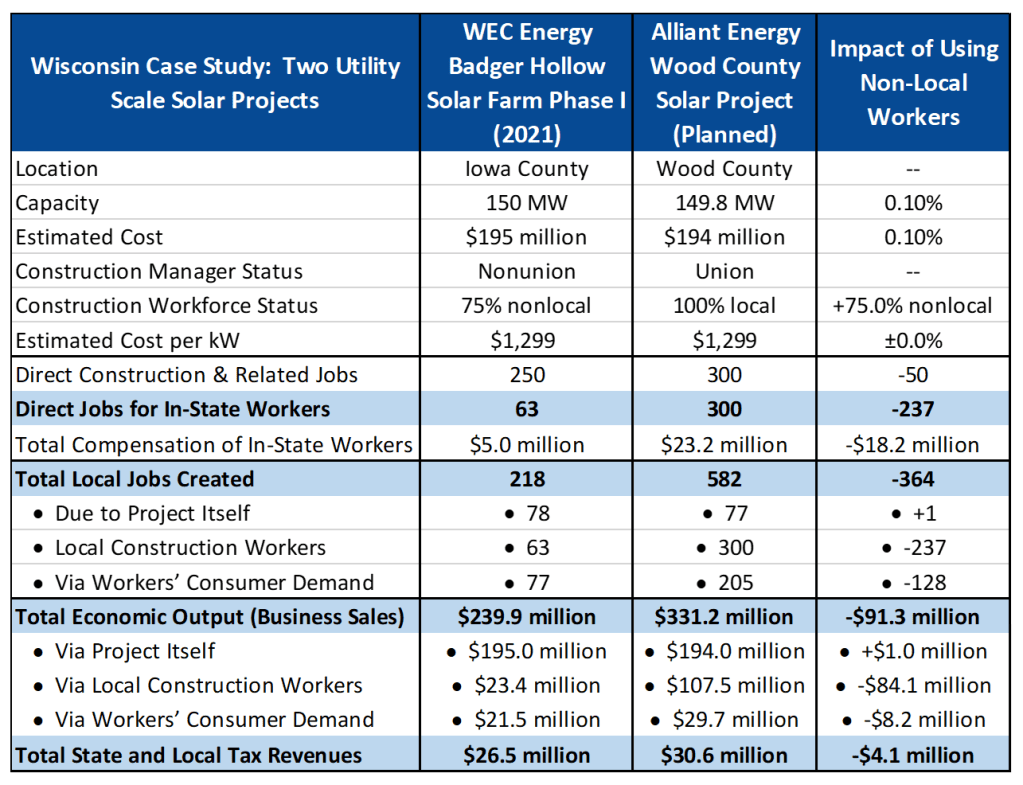 Specifically, they analyzed comparable utility scale solar projects—a phase one project in Iowa County that primarily employed nonunion construction workers from out of state, according to documents filed with the PSC, and a planned Wood County project by Alliant Energy that has selected a union construction manager.