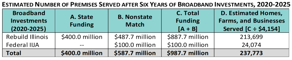 As part of the historic $45 billion Rebuild Illinois infrastructure program enacted by lawmakers in 2019, the state committed $400 million to expanding broadband access across Illinois. State, federal, and non-state matching funds—including an additional $100 million guaranteed by the bipartisan Infrastructure Investment and Jobs Act signed into law by President Biden last year—will invest a minimum of about $1 billion in broadband infrastructure in Illinois by 2025. ILEPI and PMCR researchers used data from Connect Illinois, the U.S. Census Bureau, and industry-standard IMPLAN economic modeling to project impacts of these planned investments on statewide connectivity, jobs, wages, economic growth, and tax revenues.