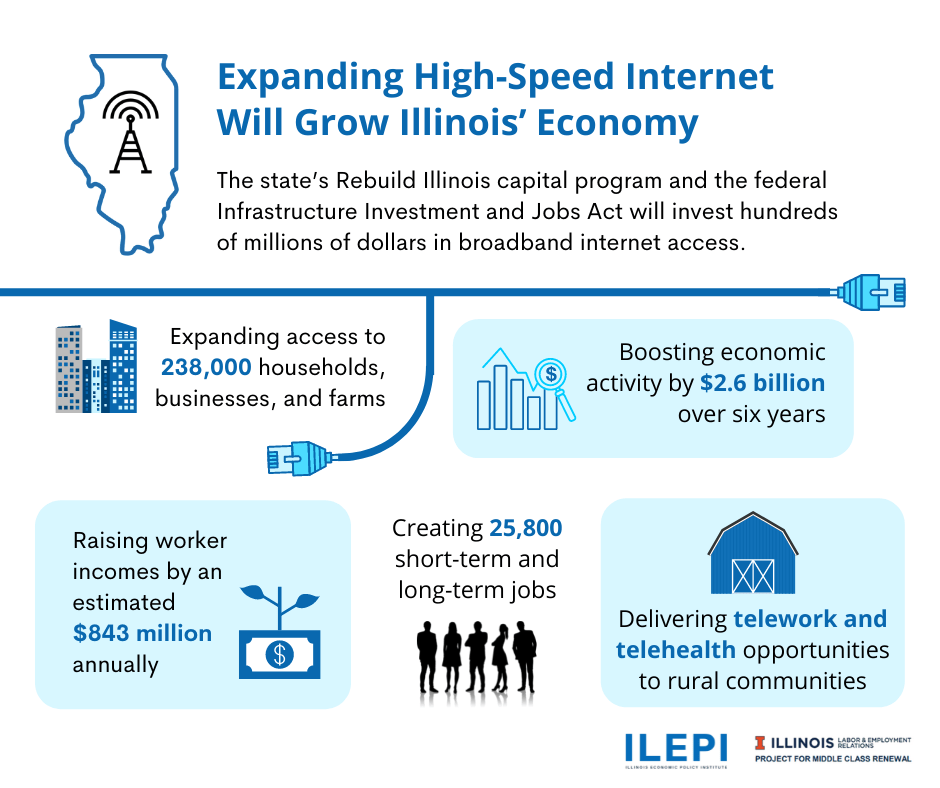 “Construction of this expanded broadband infrastructure will mean business opportunities for local contractors and suppliers, and create skilled construction jobs that pay prevailing wages and invest in apprenticeship programs,” said study coauthor and ILEPI Policy Analyst Andrew Wilson. “As this spending ripples throughout the economy and stimulates consumer demand, it will create thousands of new jobs, add billions to the state’s economic output, and generate more than $125 million in new tax revenues for state and local governments.”
