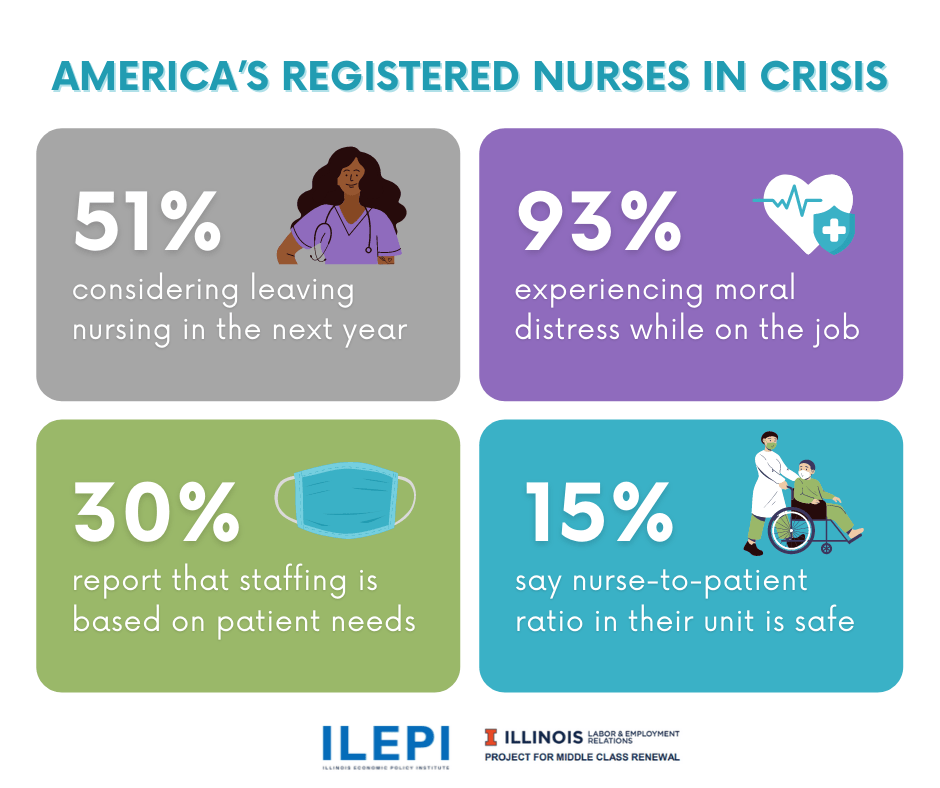 La Grange, IL: A national survey of more than 2,200 registered nurses (RNs) conducted in the fall of 2021 reveals that the strain of the COVID-19 pandemic and current industry staffing practices have together left a majority of RNs considering leaving the profession altogether. The survey was conducted by the nonprofit organization Nurses Take D.C., with the data analyzed by researchers at the Project for Middle Class Renewal at the University of Illinois at Urbana-Champaign and the Illinois Economic Policy Institute (ILEPI).