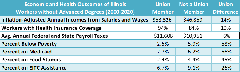 Analyzing two decades worth of data from the American Community Survey, the study found that union workers in Illinois earned 14% higher incomes on average, were about 10% more likely to have health insurance, paid more in state and federal taxes, and were half as likely to live in poverty or rely on government assistance as comparable nonunion workers.