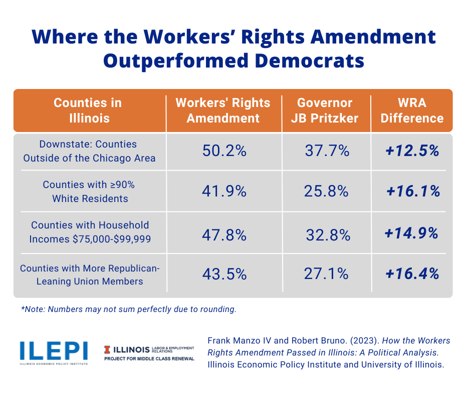 “The Workers’ Rights Amendment performed well in Democratic-leaning constituencies, but not strong enough to succeed without bipartisan support,” said PMCR Director, University of Illinois Professor, and study coauthor Robert Bruno, Ph.D. “The Amendment could not have won without support from white working-class voters from rural communities that have been drifting away from the Democratic Party.”