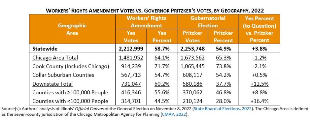 The Workers’ Rights Amendment added Section 25 to the Illinois Constitution, guaranteeing the fundamental right to organize and to bargain collectively while preventing laws from being passed that interfere with, negate, or diminish that right. Among all ballots cast, the vote was 53.4% yes and 37.6% no, with 9.0% not voting. Of those voting on the ballot question itself, Illinois residents voted 58.7% yes to 41.3% no, a net yes difference of more than +17 points. Fully 64.1% of the Chicago area voted yes and 50.2% of the rest of Illinois (“Downstate”) voted yes.