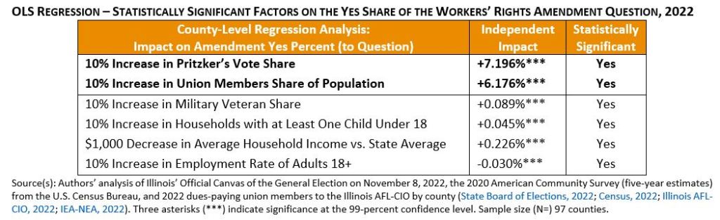 Specifically, the analysis found that a 10 percentage-point increase in Governor JB Pritzker’s share of the voter in the gubernatorial election increased the yes vote share on the Amendment by +7 points. A 10 percentage-point increase in the county’s share of residents who are union members increased the Amendment’s yes vote share by another +6 points. Working-class counties, counties with more military veterans, and counties with more households with children were also linked with higher yes vote shares on the Amendment.