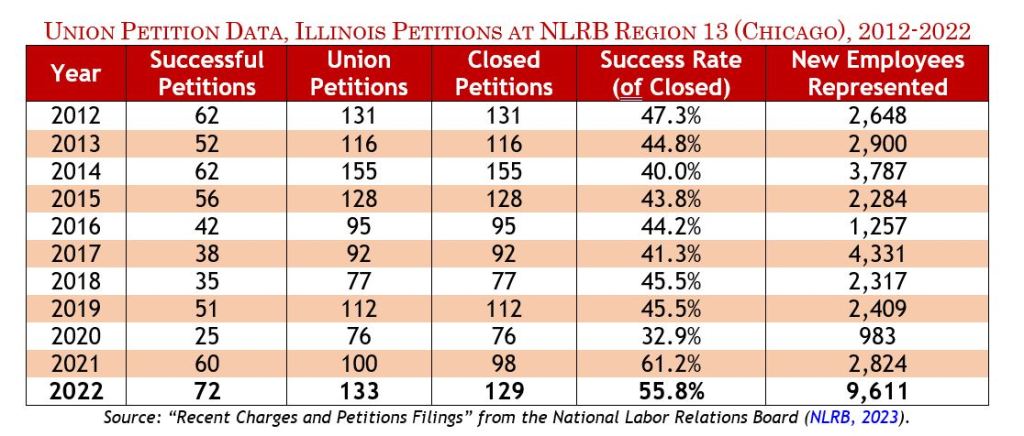 Analyzing data from the National Labor Relations Board and the Current Population Survey from the Bureau of Labor Statistics at the U.S. Department of Labor, researchers found that, despite substantial recent success in new union organizing drives, both Illinois and the Chicago area lost union members last year—even as the number of workers nationally who were dues-paying members increased for the first time since 2017. All three regions saw decreases in the shares of their workforces who were union members.