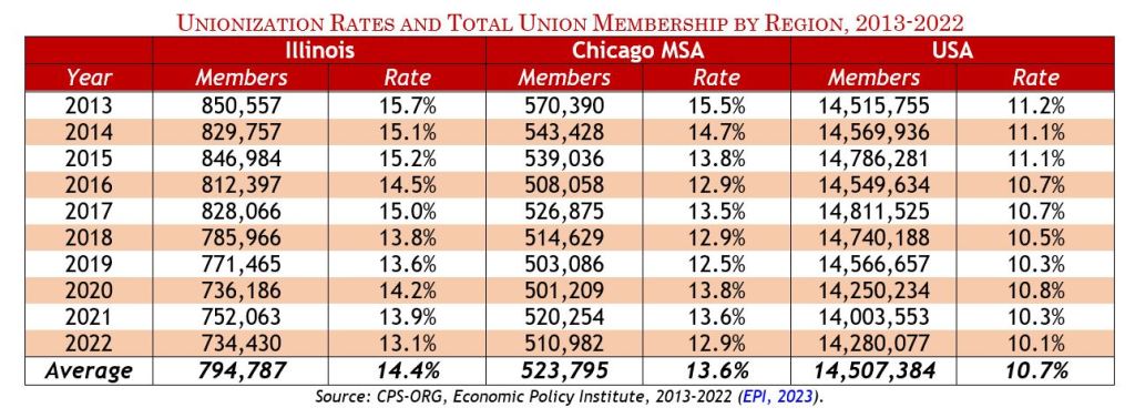 La Grange: Last year, as the number of union members in the U.S. workforce grew for the first time since 2017, Illinois saw its largest number of new union organizing petitions since 2014 and organized more workers than at any time in the last decade, according to new data compiled by the Illinois Economic Policy Institute (ILEPI) and the Project for Middle Class Renewal (PMCR) at the University of Illinois Urbana-Champaign. Nevertheless, the growth of new industries that have yet to organize and a rise in vacant positions in the highly unionized public sector resulted in a decline in unionization rates in Illinois and nationally.