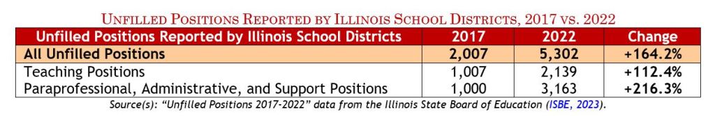 But the report’s authors cautioned that macro-level data can paint an incomplete picture on the state of union organizing and the labor market both in Illinois and the United States. They highlighted a substantial 78% increase in job vacancies in historically unionized state and local government positions since the Supreme Court imposed so-called “right-to-work” conditions on these jobs nationwide in 2018, which was 25 percentage points more than in the private sector during this period. For its part, Illinois has seen a 164% increase in unfilled positions at public school districts since 2017. Fully 13% of state government jobs sat unfilled in 2022.