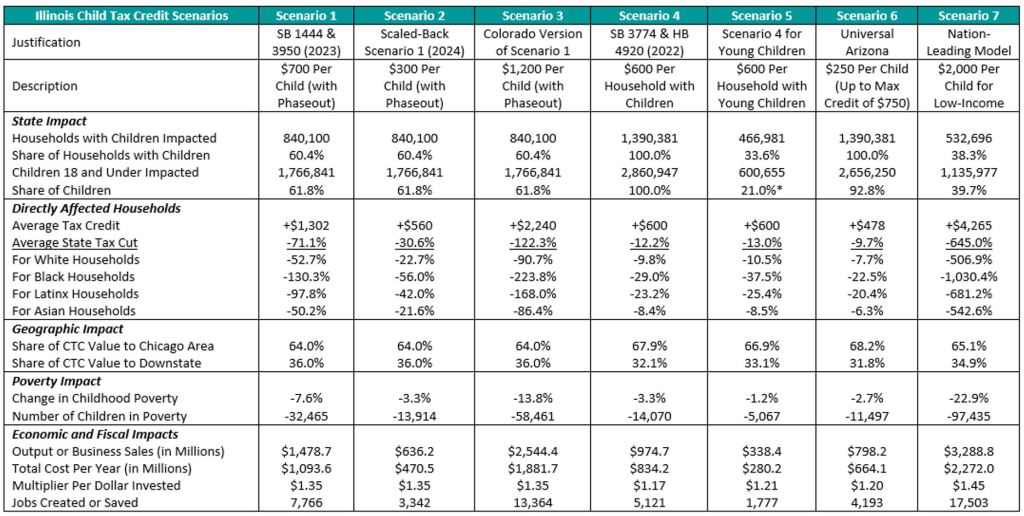 Among proposals that have been offered in the Illinois General Assembly, Senate Bill 1444 and House Bill 3950 in 2023 would have offered a $700 credit per child that is phased out for single filers earning net incomes over $50,000 per year or joint filers with net incomes over $75,000 per year. That scenario would impact six-in-10 children, reduce child poverty by 8%, and boost the economy by $1.5 billion per year. A scaled-back version with a $300 credit would decrease child poverty by 3% and grow the economy by $636 million per year, while a scaled-up version with a credit that mirrors Colorado’s maximum value of $1,200 would reduce child poverty by 13% and boost the economy by $2.5 billion annually.