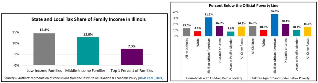 Researchers noted that, because of Illinois’ current tax system features a flat-rate income tax and relatively high property tax rates, low- and middle-income households pay a substantially higher share of their incomes in state and local taxes than their wealthier counterparts. They also detailed how both poverty disproportionately afflicts Black and Latinx households and children. Finally, they presented economic research linking the temporary expansion of the federal Child Tax Credit in 2021 with a $27 billion boost to the U.S. economy that created or saved 511,000 jobs, driven by consumer spending from low- and middle-income families directly impacted by the policy.