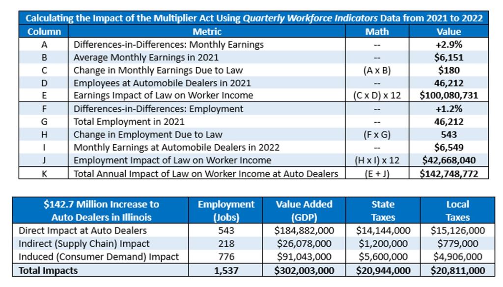 In their study, ILEPI and PMCR researchers first used data from the U.S. Census Bureau, U.S. Bureau of Labor Statistics, and National Automobile Dealers Association to compare the economic outcomes of affected workers with other private sector workers in Illinois as well as with their counterparts in neighboring states that do not have similar warranty parity laws. Researchers then utilized IMPLAN, an industry-standard economic modeling software, to assess impacts on gross domestic product (GDP) and tax revenues.