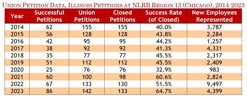 Researchers analyzed data from the National Labor Relations Board and the Current Population Survey from the Bureau of Labor Statistics at the U.S. Department of Labor. The data reveal that in 2023, the first full year of data since passage of the Workers’ Rights Amendment to its State Constitution, Illinois had its most successful year for new union organizing petitions than any other time over the last decade. Furthermore, Illinois organized more new union members over the past two years (13,896 members) than the preceding five years combined (12,864 members).