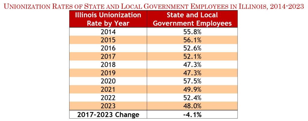 Despite these signs of resurgence, researchers noted that the overall rate of unionization in both Illinois and the nation as a whole continued to decline, driven by the loss of membership in the heavily unionized public sector following the Supreme Court’s 2018 Janus decision that imposed “right-to-work” conditions on public sector employees nationally. “Right-to-work” conditions require unions to provide services and representation to non-members for free. Both Illinois’ and the nation’s public sector unionization rates have declined since this decision, with Illinois’ state and local government unionization rate dropping by 4 percentage points.
