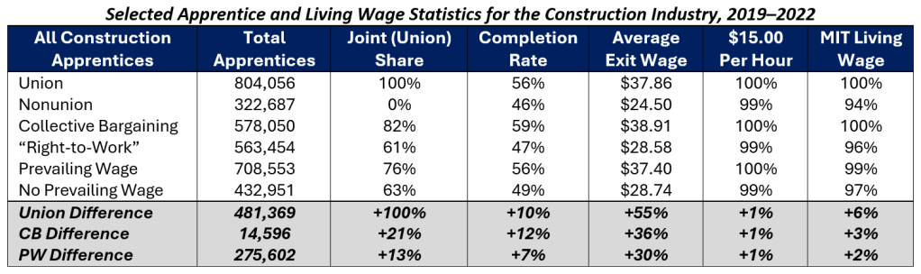 “Apprentices in joint labor-management programs and those in states with prevailing wage laws have higher completion rates, earn significantly higher starting and exit wages, and are much more likely to earn living wages,” Manzo added. “On the other hand, so-called ‘right-to-work’ laws are correlated with worse completion rates, lower wages, and fewer apprentices earning $15 per hour or achieving other living wage thresholds.”
