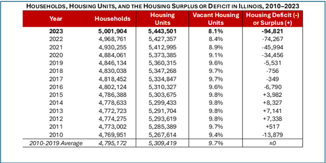 The data revealed Illinois generally had an average housing vacancy rate of 9.7% between 2010 and 2019, with the rate collapsing to nearly eight percent between 2019 and 2024, or a deficit of more than 95,000 housing units. Additionally, it revealed that Illinois has more than 47,000 “missing households” that would form under more favorable market conditions. Finally, the data showed that Illinois could naturally expect the formation of approximately 85,000 new households over the next five years, yielding a total housing need of 227,000 units.