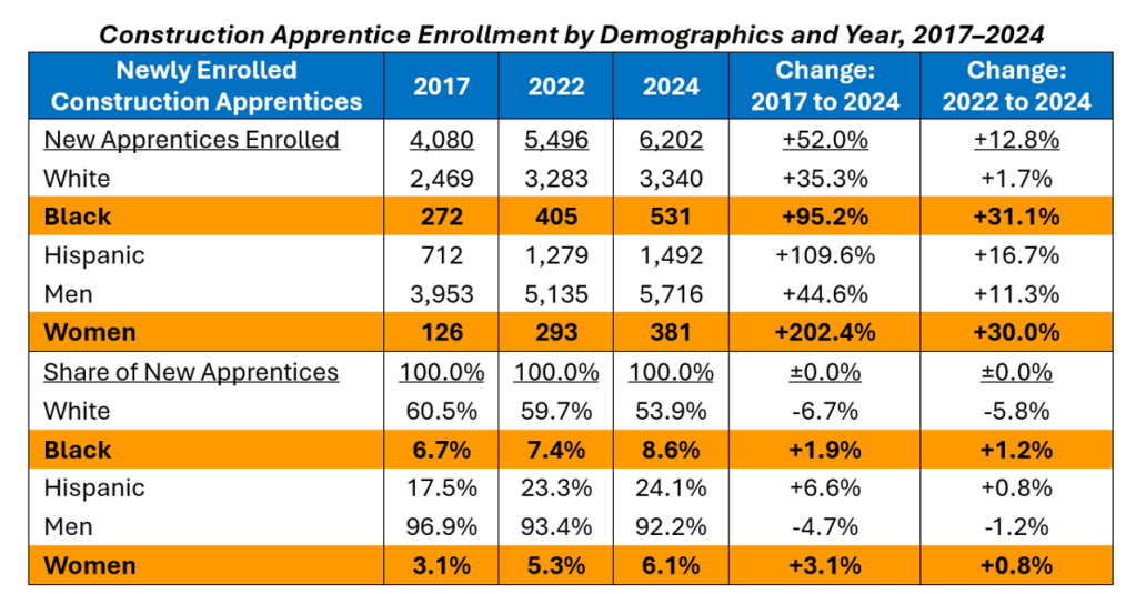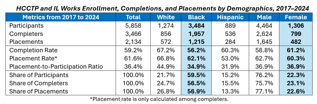 Collectively, HCCTP and IL Works enrolled more than 5,800 pre-apprentice participants from 2017 through 2024, with black and female enrollees disproportionately exceeding their share of construction apprentices statewide. Buoyed by this enrollment, the number of black apprentices has surged by 95%, and the number of female apprentices have surged by 202% since 2017-making both groups the fastest growing share of the state’s recent construction apprentices.