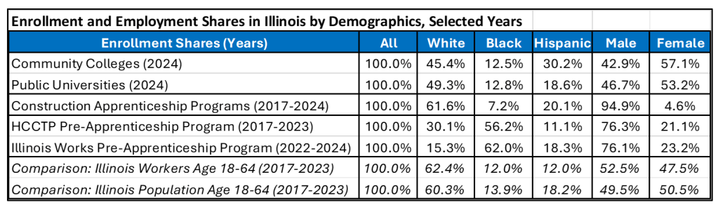 As 8-to-14-week programs, pre-apprenticeships (or apprenticeship readiness programs) offer individuals the chance to learn foundational construction skills needed to earn placement into longer term construction apprenticeship programs. These tuition-free programs—often funded via government grants to community colleges or non-profit organizations—offer industry-focused training, hands-on learning, and classroom instruction that introduces participants to career opportunities in the skilled trades. Programs also often provide access to wraparound services to address barriers to entering the construction workforce, such as childcare, transportation, and stipends. For this analysis, ILEPI and PMCR researchers examined publicly available data on investments and program outcomes in the two largest programs in Illinois—the Highway Construction Careers Training Program (HCCTP) and the Illinois Works Pre-Apprenticeship Program (IL Works).