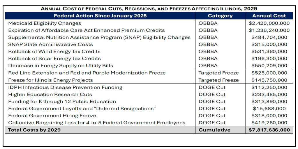 La Grange, IL: By the end of President Trump’s term, the wave of project cancellations, funding recissions, mass federal firings, and cuts to public health, nutrition, infrastructure, education, and other programs enacted by the administration in 2025 will amount to nearly $8 billion annually in lost revenue and increased out-of-pocket expenses, shrink the economy by $10 billion per year, and cost the state 86,000 jobs—according to a new analysis by the nonpartisan Illinois Economic Policy Institute (ILEPI) and the Project for Middle Class Renewal (PMCR) at the University of Illinois at Urbana-Champaign. The report also finds that these actions will cause hundreds of thousands of Illinois residents to lose access to health insurance coverage and food assistance, while shrinking state tax collections by more than $1 billion per year.